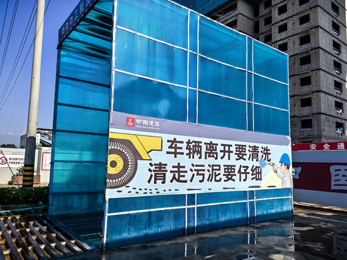 随着陈成介绍,记者环顾工地四周,眼睛所到之处,并没有想象中的扬尘出现,取而代之的是扑面而来的整洁与清新。走进工地,封闭的场界围挡上方,喷淋降尘器不断阻隔着内场烟尘散溢,施工出口设置的工程洗车机刚刚对车辆进行清洁。