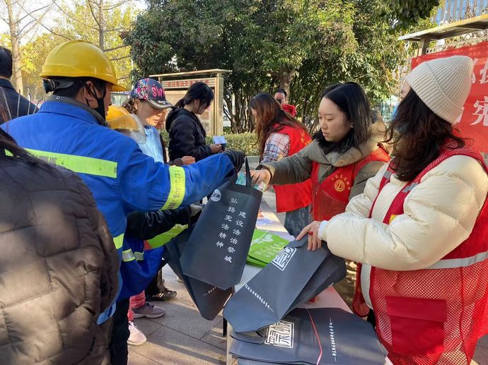 龙子湖工会联合会组织职工志愿者走上街头,为职工群众发放《宪法》《工会法》《劳动法》《劳动合同法》等与职工权益密切相关的法律宣传页与宣传品,针对职工在实际工作中可能遇到的劳动纠纷、工资福利、休息休假等问题宣传解答,增强基层职工的法律意识和依法维权能力。