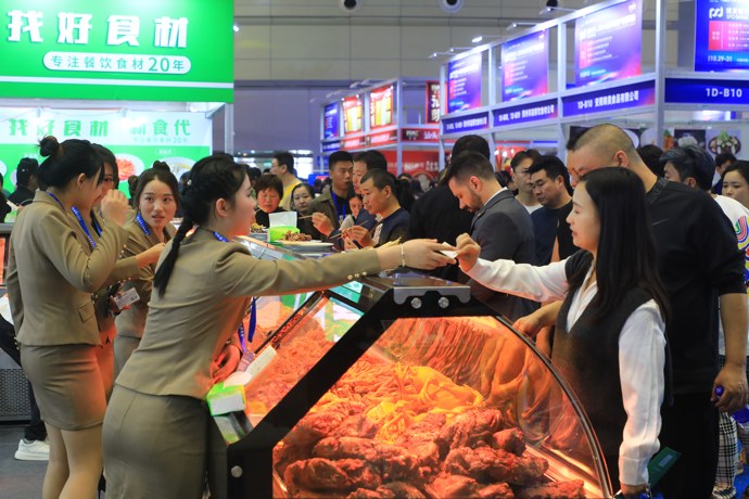 10月29日上午,在郑州国际博览中心开幕的2024全球肉类产业博览会,展厅内人头攒动,商家使出浑身解数推广自己的“拿手产品”,希望与更多商家达成合作。