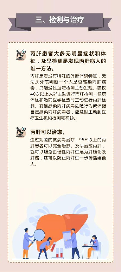 丙肝作为“隐匿的杀手”,对健康的危害很大。不同于其它病毒性肝炎,感染丙肝病毒往往没有症状,但55%-85%丙肝感染者会变成慢性丙肝。晚发现、未及时治疗是造成肝硬化、肝癌的重要原因。
