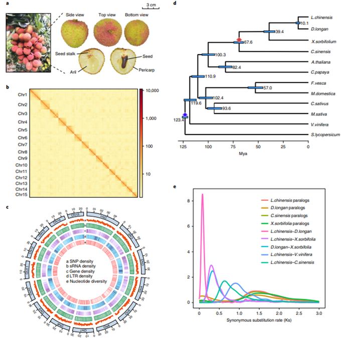 图2: a.荔枝果实示意图;b.荔枝基因组图谱;c.荔枝基因组特征;d.荔枝基因组系统发育分析;e.不同品种荔枝的同义突变率比较(图片来源:参考文献[1])