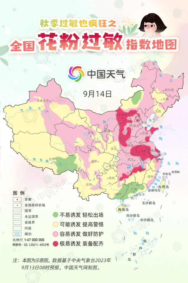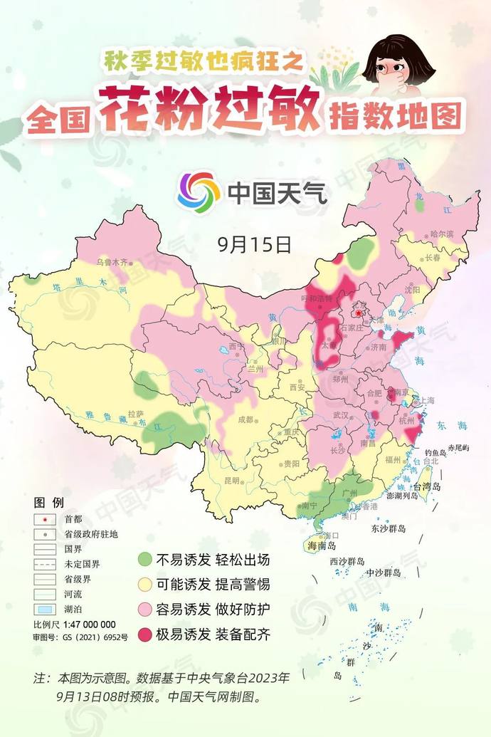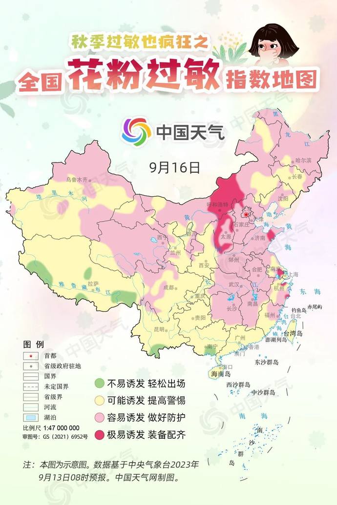 “9月14日至16日,我国中东部大部地区都处于容易过敏区域,其中内蒙古、山西、山东等地部分地区极易诱发过敏。”中国天气网气象分析师王伟跃表示,目前北方正处于夏秋转换时节,此时常见的花粉过敏原有蒿属、葎草属、豚草属等草类,北方晴朗干燥天气利于这些草类的花粉传播。