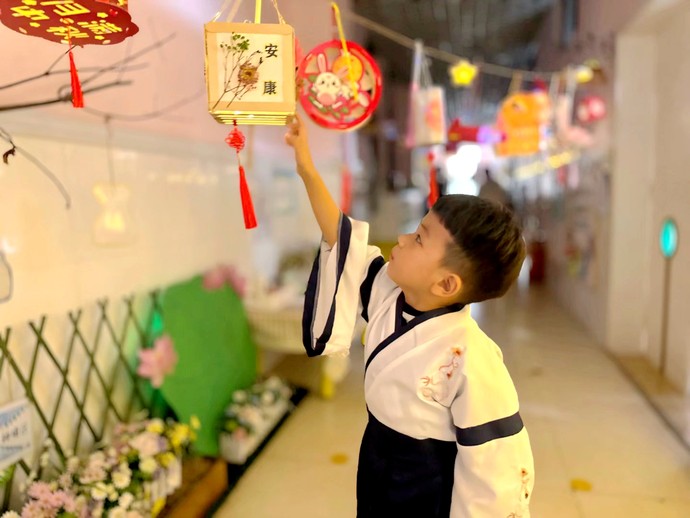 活动前, 老师通过给孩子讲解典故、观看图片和视频的形式,让孩子们知道中秋节是中国传统文化节日,了解中秋节的来历和各种习俗。赏花灯是中秋节一项重要活动,小班幼儿带来了和家人一起制作的花灯,老师和家长以及孩子们一起动手,用智慧与巧手共同营造节日里最美的花灯展。当萌娃们穿上飘逸优美的古典服饰,提着样式各异的花灯,听着源远流长的传统故事,幼儿园里谱写着一场古意浓浓的别样中秋。中班幼儿在教师的引导下进行了水粉喷画扇子创作,孩子们在感受美创造美的同时,体会着传统文化的独特魅力。大班进行了制作月相图、后羿射日、套圈等活动。孩子们通过观察月相,利用奥利奥饼干拧一拧、刮一刮、摆一摆,制作奥利奥月相图;随后开始了后羿射日活动,孩子们依次尝试用弓箭击中靶心,体会成功的快乐。