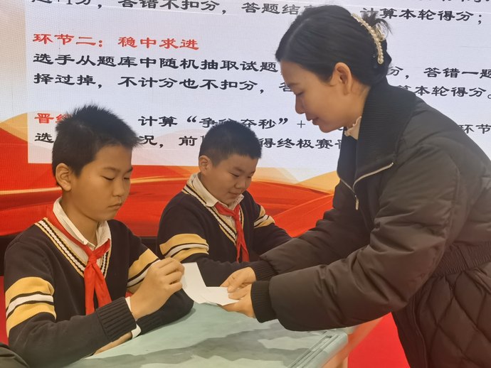 最终彭海瑞、柴旭阳、辛明阳同学分别包揽竞赛前三名,由任成睿等同学组成的红色战队获得“最强团队奖”,由陈首言等同学组成的蓝色战队获得“最佳合作奖”,学校党支部副书记藏丽为孩子们颁发荣誉证书,并对他们的现场表现给予高度赞扬。