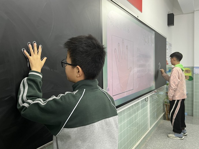 在她的指导下,同学们纷纷化身“小画家”,在白纸上描绘出左手的轮廓,学生通过观察,意识到没有两只完全相同的手,也没有完全相同的人。“猜猜它是谁”环节让课堂氛围变得更加轻松愉悦,寓教于乐,师生频频互动。