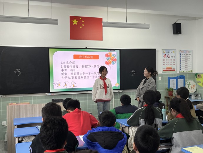 学生踊跃上台做自我介绍,通过“我有你没有”的特点展示,学生们对自己都有了新的认知。在“我的档案”完善环节中,学生们深入讨论,从他人那里了解自己,并在自己的画上补充自己的优点和缺点,树立自己的正确认知,做到发扬优点改正缺点,正确接受真实的自己。