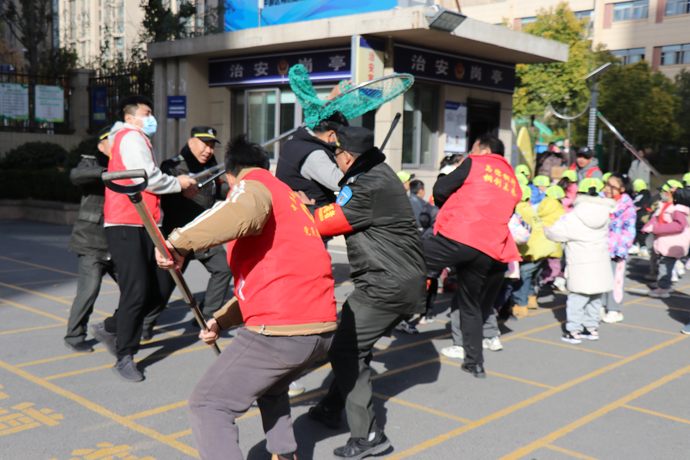当日上午,由一位体育老师模拟“不法分子”,拿着凶器冲向正在放学的学生队伍,负责警戒的值班领导和老师、校园保安、巡防队员第一时间手持防暴长棍、钢叉、盾牌等装备与“不法人员”周旋,最终将歹徒制服,并解除警报。