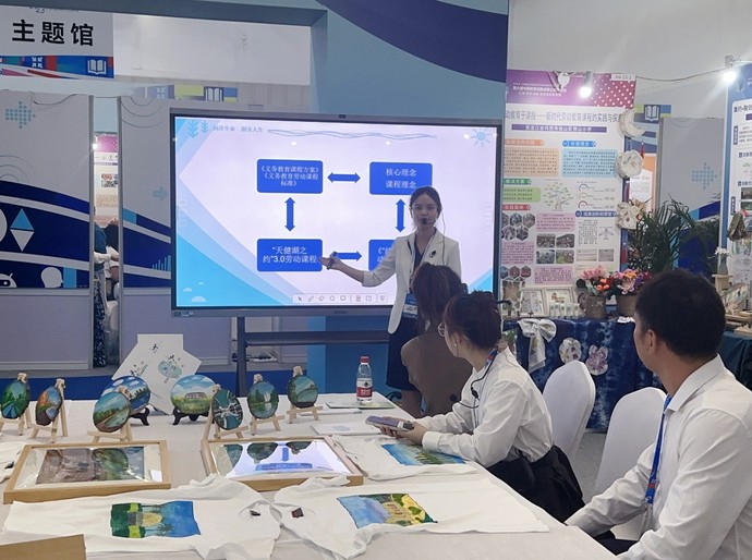 学校展台上图文并茂的劳动教育成果展板,劳动课程系列丙烯画,研究成果手册、研发教材和实践手册,充分展示了该校在劳动教育课程建设和教育实践中的积极探索以及坚持全环境育人视野下实施劳动教育的成果。
