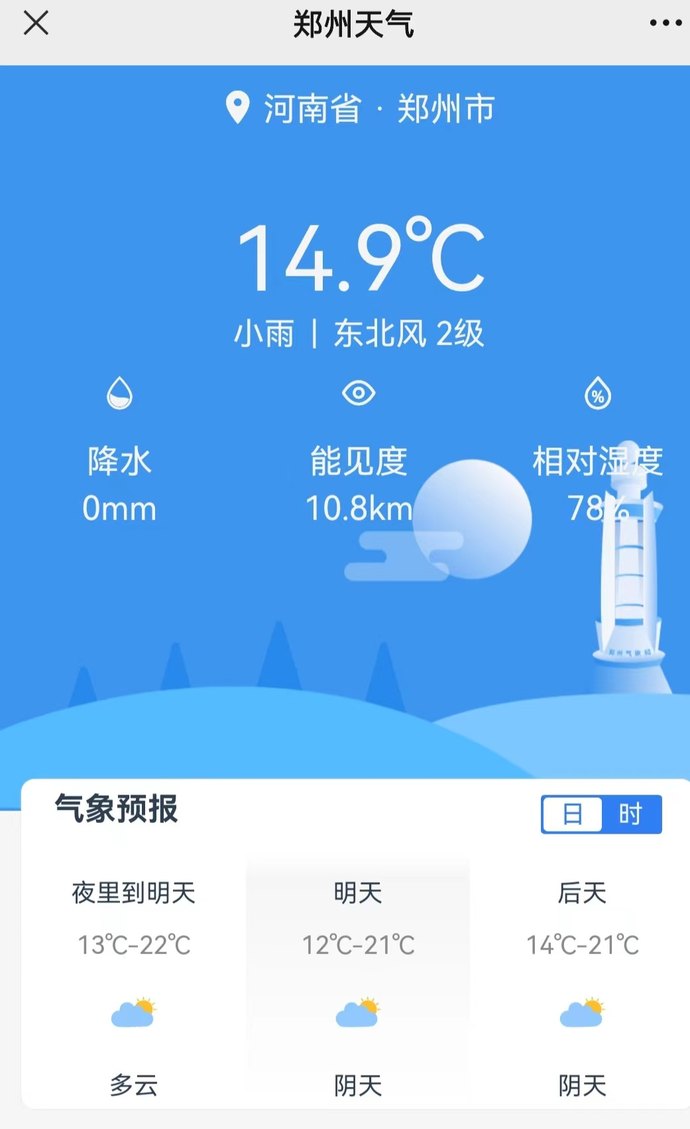 实时天气包括气温、风力风向、能见度、相对湿度和降水量等。今日18时,记者查看实时天气情况时看到,气温15.5℃,东风2级,降水量为零,能见度15.6公里,相对湿度74%。该微信号还提供三天内的天气预测。其中,今天夜里到明天,郑州多云,气温13℃到22℃;明天,郑州阴天,气温12℃到21℃;后天,郑州阴天,气温14℃到21℃。