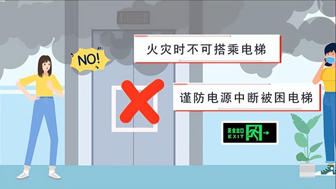 火灾发生时,不要乘坐电梯,防止被困在电梯内发生危险。