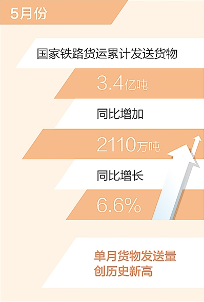 记者从中国国家铁路集团有限公司获悉:5月份,国家铁路货运保持强劲增长态势,累计发送货物3.4亿吨,同比增加2110万吨,同比增长6.6%,单月货物发送量创历史新高。
