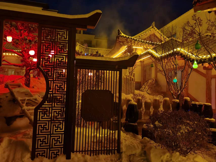 在延吉的冰天雪地中,泡温泉也成为新的网红项目。琵岩山温泉古村落,总占地面积4.9公顷,项目总投资3亿元,酒店客房162间,室内温泉馆包含拥有多种主题温泉泡池共计38个、室外温泉泡池11个、私汤民宿21栋,同时配备了书吧、休息大厅、特色汗蒸房、儿童游乐区、电玩城、室外水乐园自助餐厅、棋牌室等配套设施。琵岩山温泉古村落依托琵岩山自然资源优势,其温泉水含有“氟”元素超过国家标准的7倍,氟是人体必需的微量元素之一,高氟泉还被誉为温泉中的蓝宝石。琵岩山温泉古村落以朝鲜族民俗文化为背景,是集温泉康养、休闲度假、民俗体验、特色民宿、地方美食等为一体,全方位、多层次、全天候四季经营的温泉康养度假区。