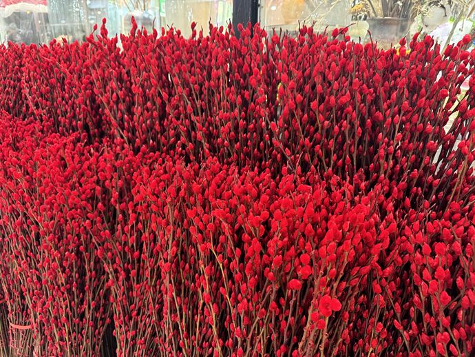 据了解,银柳谐音“银留”,有留银和招财进宝的寓意,被叫做旺财之花。因为“家有银柳,越过越有”的含义,所以红色的银柳在春节期间格外受欢迎,因此,它又被称为“年宵花”。“银柳不错,放在花瓶很漂亮,准备摆在客厅里点缀,春节家里放上这几束,年味马上出来了,很喜庆。”购买过银柳的一位顾客说。
