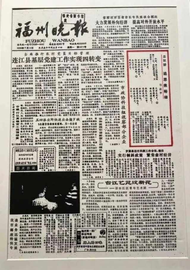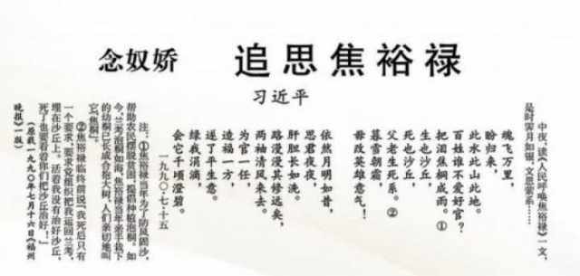 1990年7月15日夜晚,雨过初晴,习近平读了新闻报道《人民呼唤焦裕禄》,心情难以平静,当即填下一阕《念奴娇·追思焦裕禄》:“魂飞万里,盼归来,此水此山此地。百姓谁不爱好官?把泪焦桐成雨……”第二天的《福州晚报》刊登了这首词