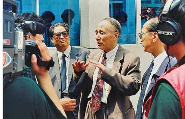 新华社记者穆青(中)、冯健(右二)和周原(右四)在兰考县接受记者采访(摄于1994年5月)