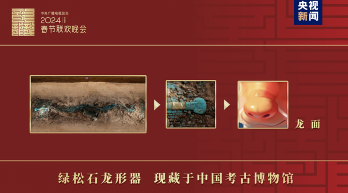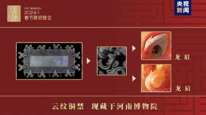 12月6日,中央广播电视总台龙年春晚吉祥物“龙辰辰”正式亮相与大家见面。脱胎于众多带“龙”的文物,“龙辰辰”的造型结合了5件珍贵文物元素,其中,龙鼻来自河南偃师二里头遗址的绿松石龙形器,眉弓和龙肩上的装饰取自河南博物院收藏的云纹铜禁纹饰。