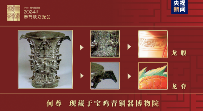 龙脊结构、龙腹纹则来源于最早记载“中国”二字的西周何尊侧面的四道扉棱和云雷纹,何尊出土于陕西宝鸡贾村镇,是3000多年前西周早期贵族“何”铸造的一件青铜礼器,尊体上篆刻铭文中“宅兹中国”,是目前所知“中国”一词的最早出现。