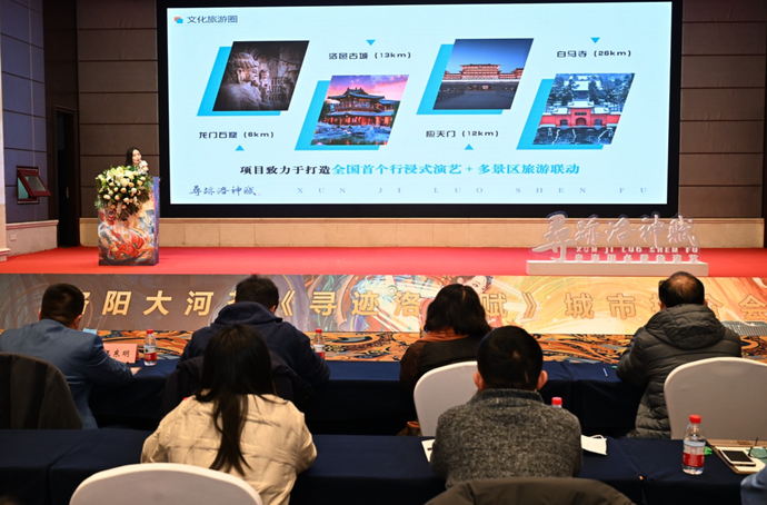 推介会介绍了洛阳大河荟项目整体概况和“文化+旅游+商业”的创新融合发展模式,着重推介该项目的核心业态《寻迹洛神赋》。据了解,洛阳大河荟项目由洛阳国晟集团倾力打造,博采上下5000年河洛精粹,集数字光影演艺、“博物馆+”商业、隋唐文化主题设计师酒店和剧本娱乐四大业态于一体,打造年轻化社交、娱乐、休闲的沉浸式“都市文商旅综合体”。作为大河荟的核心业态之一,中国首部数字行浸式演艺——《寻迹洛神赋》以“洛阳神韵”为文化符号,以河洛文化为创作蓝本,将洛阳这座“千古神都”的精华所在装载其中,用科技艺术讲述洛阳故事,开创了展演秀融合的演艺形态。