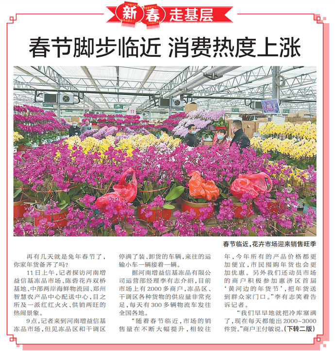 11日上午,记者探访河南增益信基冻品市场、陈砦花卉双桥基地、中部两岸海鲜物流园、郑州智慧农产品中心配送中心,目之所及一派红红火火、供销两旺的热闹景象。(今日《郑州日报》1版、2版)