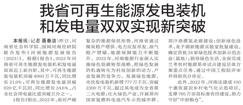 昨日,河南省社会科学院、国网河南经研院联合发布《河南能源发展报告(2023)》。根据《报告》,2022年河南省可再生能源发电装机和发电量双双迈上新台阶,其中,可再生能源发电装机突破4900万千瓦,同比增长21.9%;可再生能源发电量突破820亿千瓦时,同比增长24.6%,占全社会用电量比重突破五分之一。(今日《郑州日报》1版)