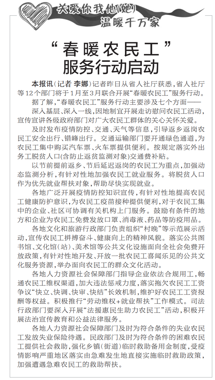 记者昨日从省人社厅获悉,省人社厅等12个部门将于1月至3月联合开展“春暖农民工”服务行动。(今日《郑州日报》2版)