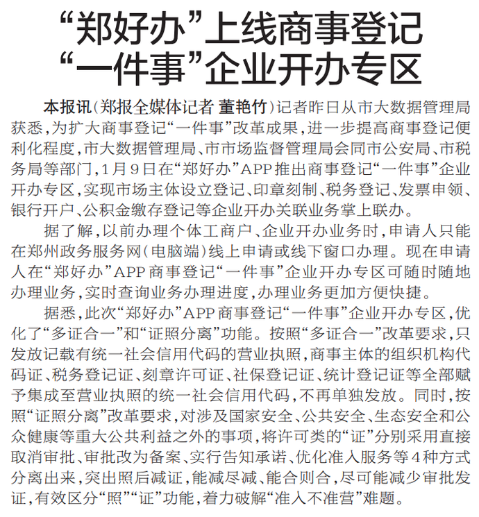 记者昨日从市大数据管理局获悉,为扩大商事登记“一件事”改革成果,进一步提高商事登记便利化程度,市大数据管理局、市市场监督管理局会同市公安局、市税务局等部门,1月9日在“郑好办”APP推出商事登记“一件事”企业开办专区,实现市场主体设立登记、印章刻制、税务登记、发票申领、银行开户、公积金缴存登记等企业开办关联业务掌上联办。(今日《郑州日报》2版)