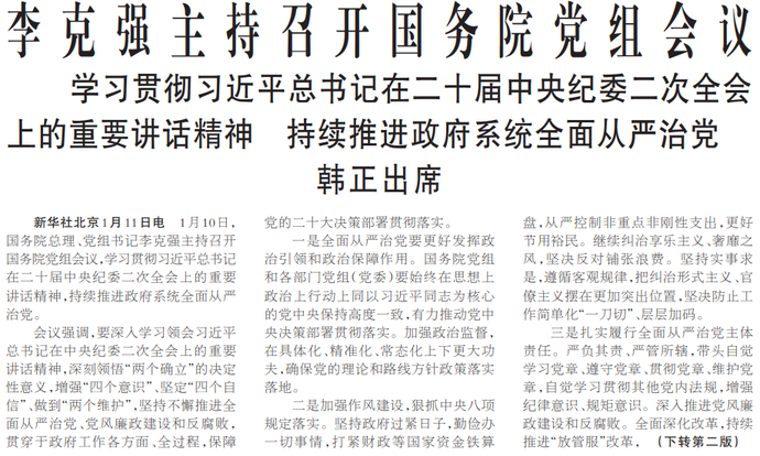 1月10日,国务院总理、党组书记李克强主持召开国务院党组会议,学习贯彻习近平总书记在二十届中央纪委二次全会上的重要讲话精神,持续推进政府系统全面从严治党。(今日《人民日报》1版、2版)