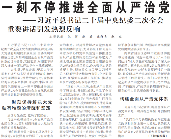 广大党员、干部表示,要深入学习贯彻习近平总书记重要讲话精神,始终坚持问题导向,保持战略定力,发扬彻底的自我革命精神,永远吹冲锋号,在新时代新征程上一刻不停推进全面从严治党,为全面建设社会主义现代化国家开好局起好步提供坚强保障。(今日《人民日报》1版、4版)