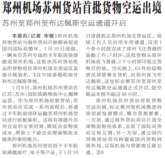 郑州机场异地货站与海外货站开始联袂促进国内国际双循环。1月10日凌晨,一辆来自苏州专线的卡车航班徐徐驶进郑州机场,这批由苏州货站收运的货物将经郑州机场北货运区直接分拨装机,飞往中国香港和匈牙利布达佩斯等地。(今日《河南日报》1版)
