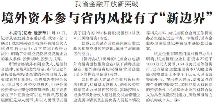 1月11日,记者从省发展改革委获悉,我省7部门联合印发《河南省合格境外有限合伙人试点暂行办法》,明确了外商投资股权投资类企业的准入条件、投资领域、投资方式等。(今日《河南日报》1版)