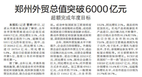 郑州外贸总值突破6000亿元