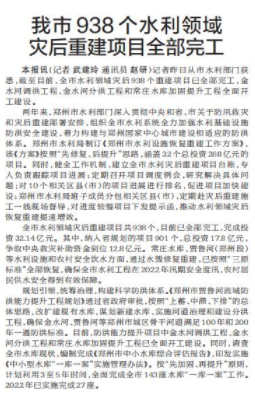 记者昨日从市水利部门获悉,截至目前,全市水利领域灾后938个重建项目已全部完工,金水河调洪工程、金水河分洪工程和常庄水库加固提升工程全面开工建设。(今日《郑州日报》2版)
