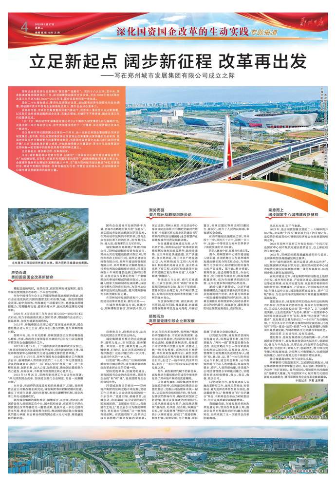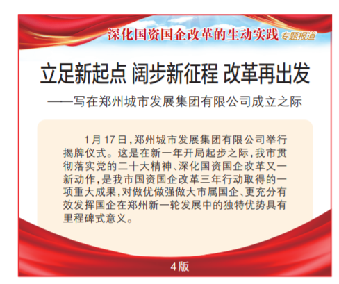 1月17日,郑州城市发展集团有限公司举行揭牌仪式。这是在新一年开局起步之际,我市贯彻落实党的二十大精神、深化国资国企改革又一新动作,是我市国资国企改革三年行动取得的一项重大成果,对做优做强做大市属国企、更充分有效发挥国企在郑州新一轮发展中的独特优势具有里程碑式意义。(今日《郑州日报》1版、4版)