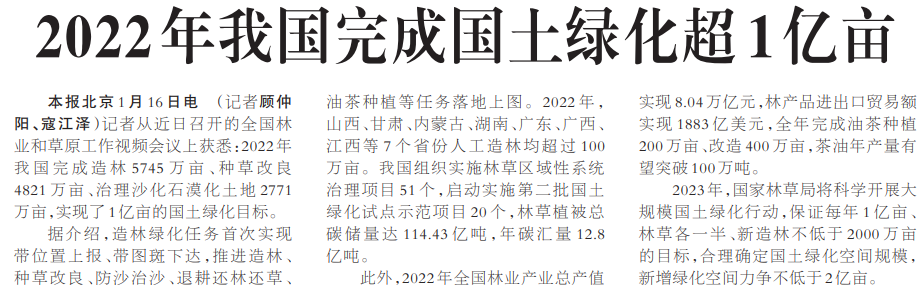 2022年我国完成国土绿化超1亿亩