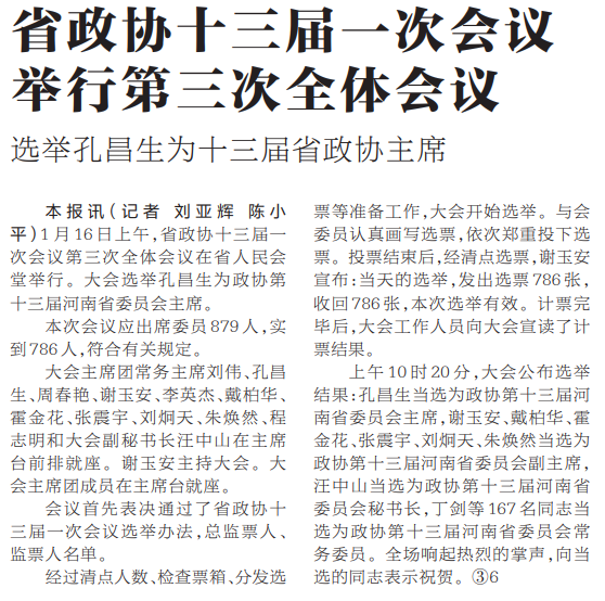 1月16日上午,省政协十三届一次会议第三次全体会议在省人民会堂举行。大会选举孔昌生为政协第十三届河南省委员会主席。(今日《河南日报》1版)
