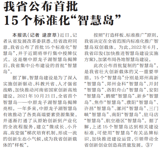 近日,记者从省发展改革委获悉,经省政府同意,我省公布了首批15个标准化“智慧岛”,并于近期将举行集中授牌仪式。这是继中原龙子湖智慧岛揭牌后,我省集中公布建设的首批“智慧岛”。(今日《河南日报》1版)