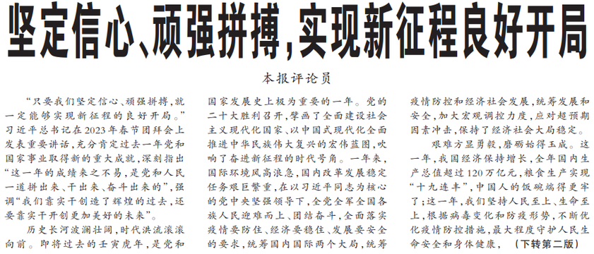 ■ 2023年是全面贯彻党的二十大精神的开局之年,希望与挑战并存。我们要坚持稳字当头、稳中求进,更好统筹国内国际两个大局,更好统筹疫情防控和经济社会发展,更好统筹发展和安全,全面深化改革开放,努力实现经济运行整体好转,推动人民生活持续改善。只要我们坚定信心、顽强拼搏,就一定能够实现新征程的良好开局