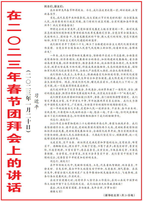 中共中央、国务院20日上午在人民大会堂举行2023年春节团拜会。中共中央总书记、国家主席、中央军委主席习近平发表讲话,代表党中央和国务院,向全国各族人民,向香港特别行政区同胞、澳门特别行政区同胞、台湾同胞和海外侨胞拜年。
