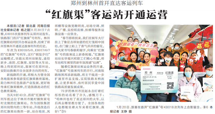 1月20日7点整,K8018次旅客列车从郑州站发车,铁路部门首开“红旗渠”号列车。林州红旗渠站同时开办客运业务,结束了郑州至林州不通直达旅客列车的历史。(今日《河南日报》2版)