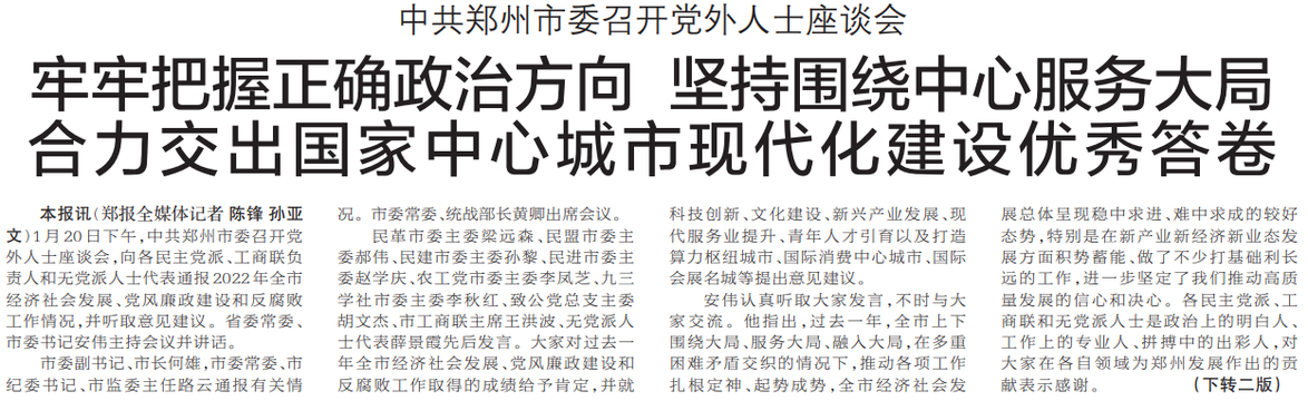 1月20日下午,中共郑州市委召开党外人士座谈会,向各民主党派、工商联负责人和无党派人士代表通报2022年全市经济社会发展、党风廉政建设和反腐败工作情况,并听取意见建议。省委常委、市委书记安伟主持会议并讲话。