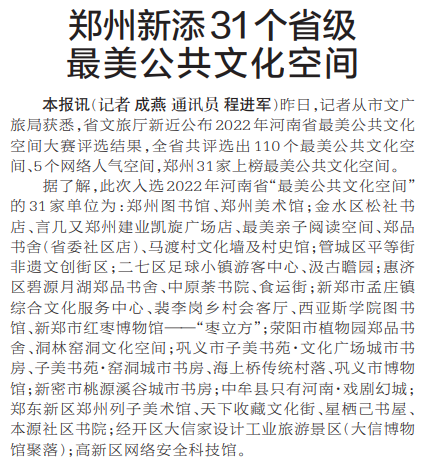 昨日,记者从市文广旅局获悉,省文旅厅新近公布2022年河南省最美公共文化空间大赛评选结果,全省共评选出110个最美公共文化空间、5个网络人气空间,郑州31家上榜最美公共文化空间。(今日《郑州日报》2版)