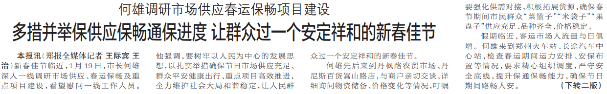 新春佳节临近,1月19日,市长何雄深入一线调研市场供应、春运保畅及重点项目建设,看望慰问一线工作人员。他强调,要树牢以人民为中心的发展思想,以扎实举措确保节日市场供应充足、群众平安健康出行、重点项目高效推进,全力维护社会大局和谐稳定,让人民群众过一个安定祥和的新春佳节。(今日《郑州日报》1版、2版)