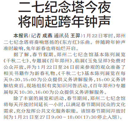 1月22日零时,郑州二七纪念塔将奏响悠扬的《东方红》乐曲。伴随跨年钟声准时敲响,兔年新春也将灿烂开启。(今日《郑州日报》3版)