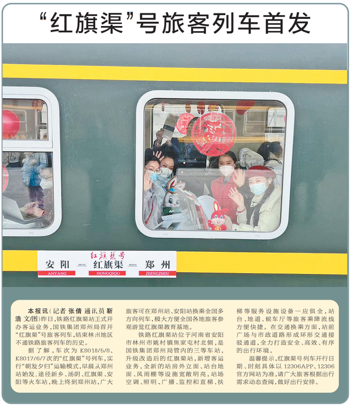 昨日,铁路红旗渠站正式开办客运业务,国铁集团郑州局首开“红旗渠”号旅客列车,结束林州地区不通铁路旅客列车的历史。(今日《郑州日报》2版)