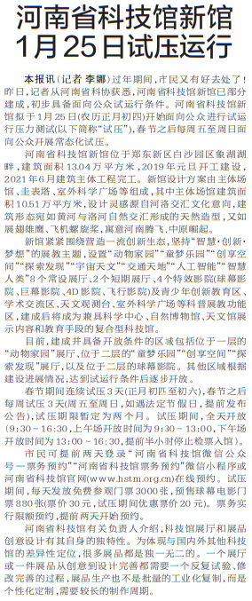 过年期间,市民又有好去处了!昨日,记者从河南省科协获悉,河南省科技馆新馆已部分建成,初步具备面向公众试运行条件。河南省科技馆新馆拟于1月25日(农历正月初四)开始面向公众进行试运行压力测试(以下简称“试压”),春节之后每周五至周日面向公众开展常态化试压。(今日《郑州日报》3版)