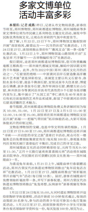 昨日,记者从市文物局获悉,新春佳节将至,郑州博物馆、郑州商都遗址博物院、郑州城隍庙等多家文博单位将为市民献上系列特色主题文化活动,展现中华民族优秀传统文化,让观众在祥和的气氛中欢度佳节。(今日《郑州日报》3版)