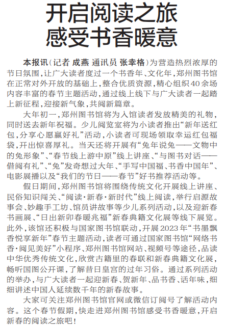 为营造热烈浓厚的节日氛围,让广大读者度过一个书香年、文化年,郑州图书馆在正常对外开放的基础上,整合优质资源,精心组织40余场内容丰富的春节主题活动,通过线上线下与广大读者一起踏上新征程,迎接新气象,共阅新篇章。(今日《郑州日报》3版)
