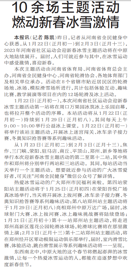 昨日,记者从河南省全民健身中心获悉,从1月22日(正月初一)到2月3日(正月十三),2023年河南省社区运动会迎新春冰雪主题活动将在中原大地陆续展开。届时,人们可就近参与其中,在冰雪运动中感受激情,喜迎新春。(今日《郑州日报》3版)