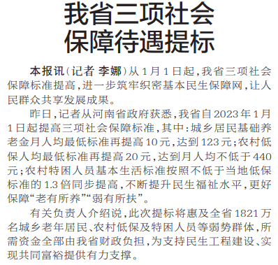 从1月1日起,我省三项社会保障标准提高,进一步筑牢织密基本民生保障网,让人民群众共享发展成果。(今日《郑州日报》2版)