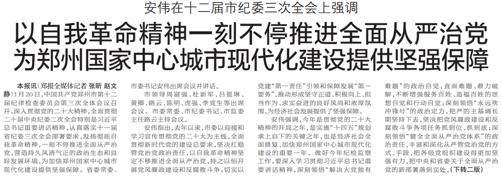 1月20日,中国共产党郑州市第十二届纪律检查委员会第三次全体会议召开,深入贯彻党的二十大精神,全面贯彻二十届中央纪委二次全会特别是习近平总书记重要讲话精神,认真落实十一届省纪委三次全会部署要求,发扬彻底自我革命精神,一刻不停推进全面从严治党,营造持久风清气正的政治生态和良好发展环境,为加快郑州国家中心城市现代化建设提供坚强保障。省委常委、市委书记安伟出席会议并讲话。